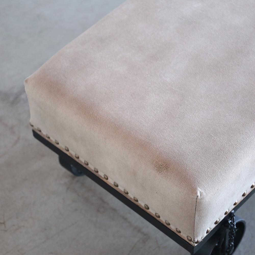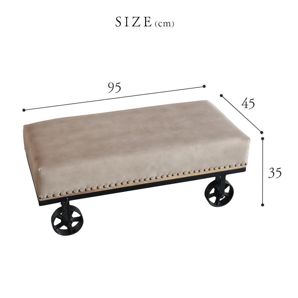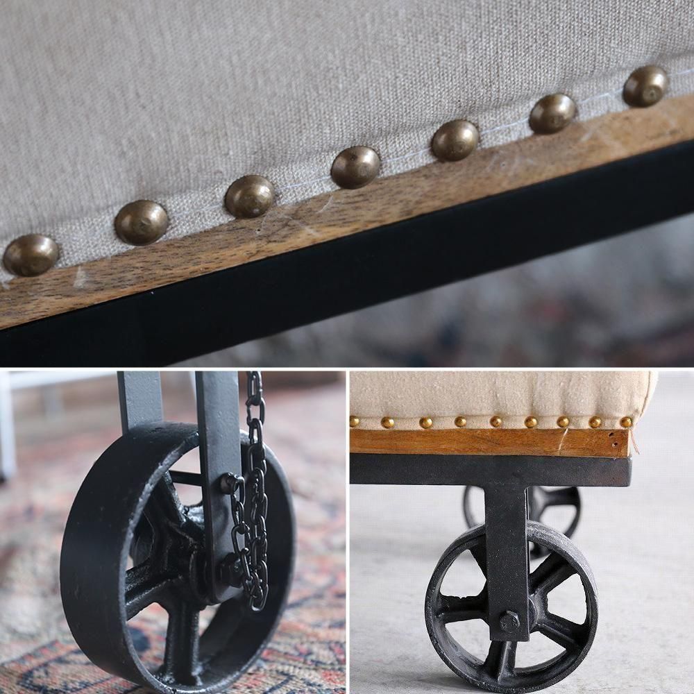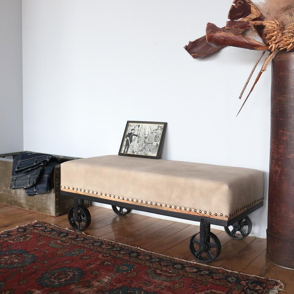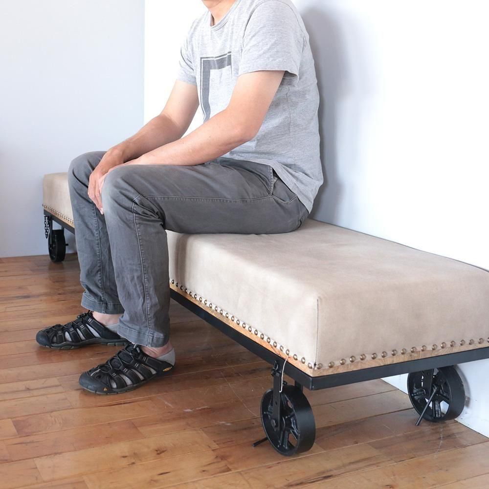 ▮無骨で男前な滑車の付いたベンチあえて綺麗な物を選ばず、玄人好きな本物の男らしさを演出。ヴィンテージ加工を施したファブリックでより男前に。1人暮らしにはもちろん、飲食店でも落ち着いたソファー席に雰囲気よく設置できるかと思います。▮クッション性も良いので抜群の座り心地硬めのクッションを入れて沈み込まない様に座り心地と座った後の見え方にもこだわりました。男性はもちろん、女性にも気に入っていただけるデザインに仕上がっています。キャンバス生地には手作業でヴィンテージ加工を施しているので、一つとして同じものはありません。ヴィンテージ加工したスタッズを使用しています。ストッパーで横へのズレ(転がり)は軽減されます。クッションにはしっかりとした厚みを持たせているので、見た目にも重厚感があります。