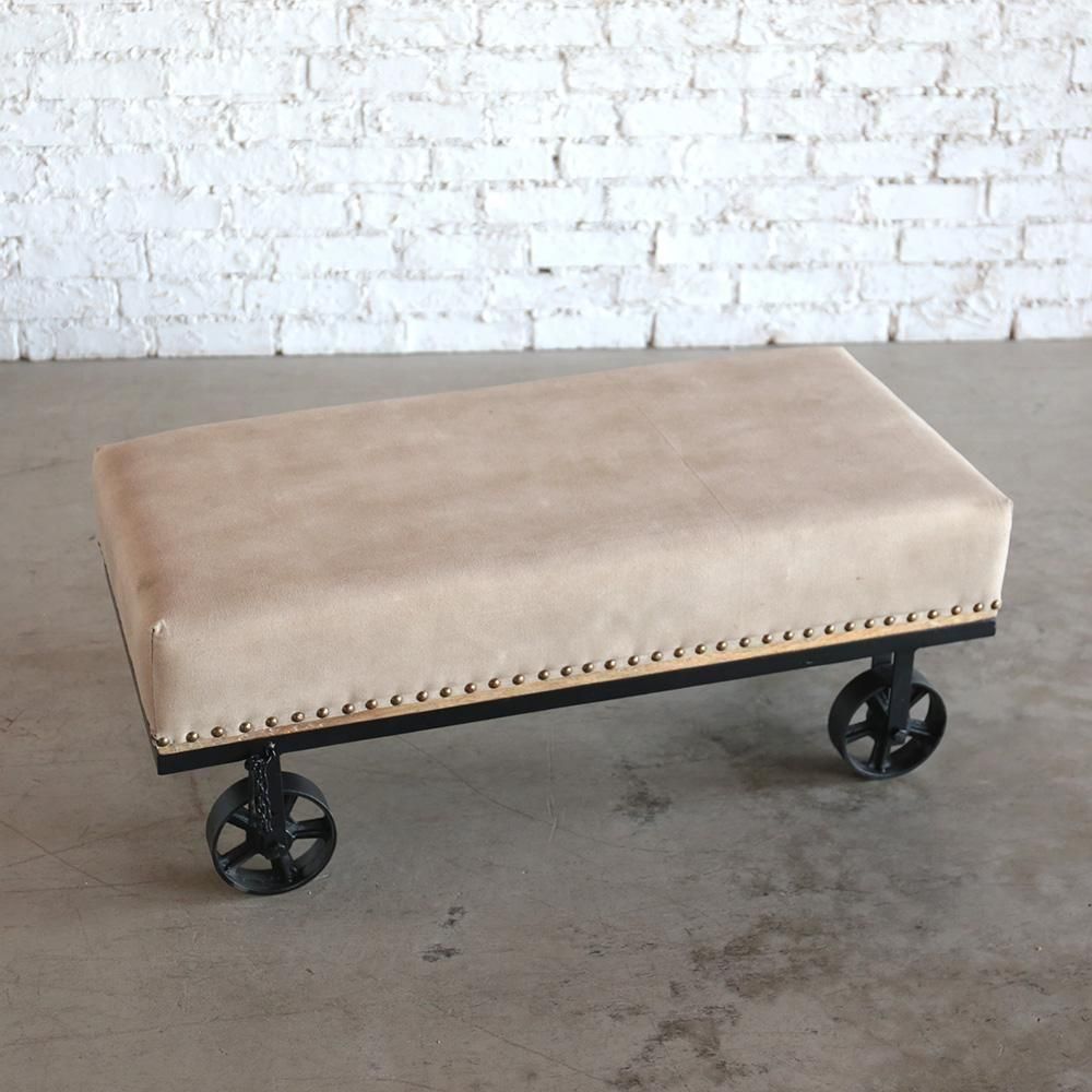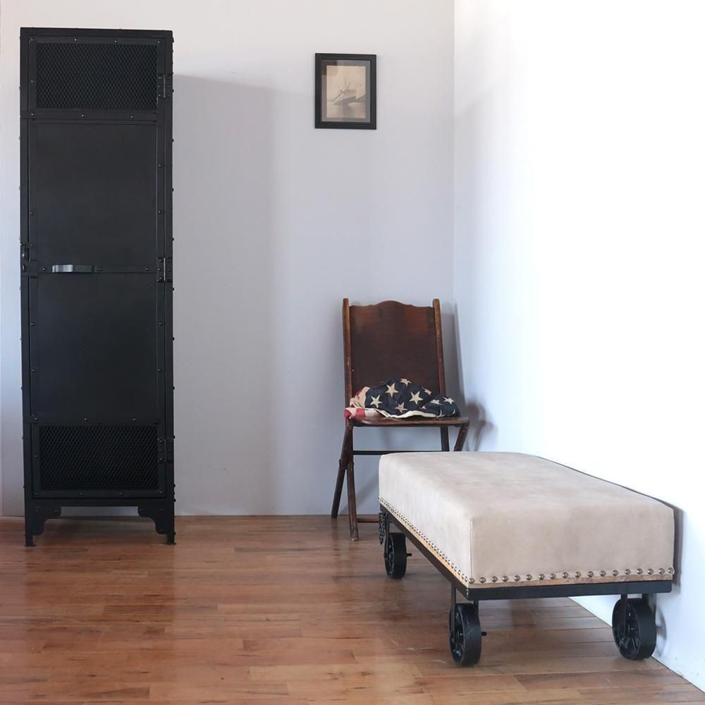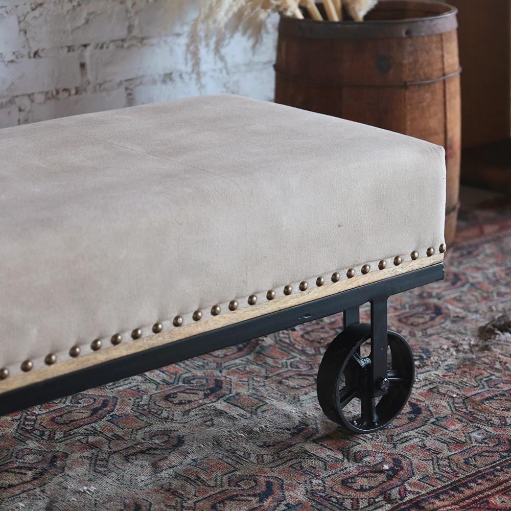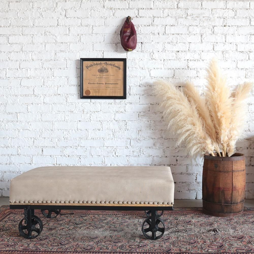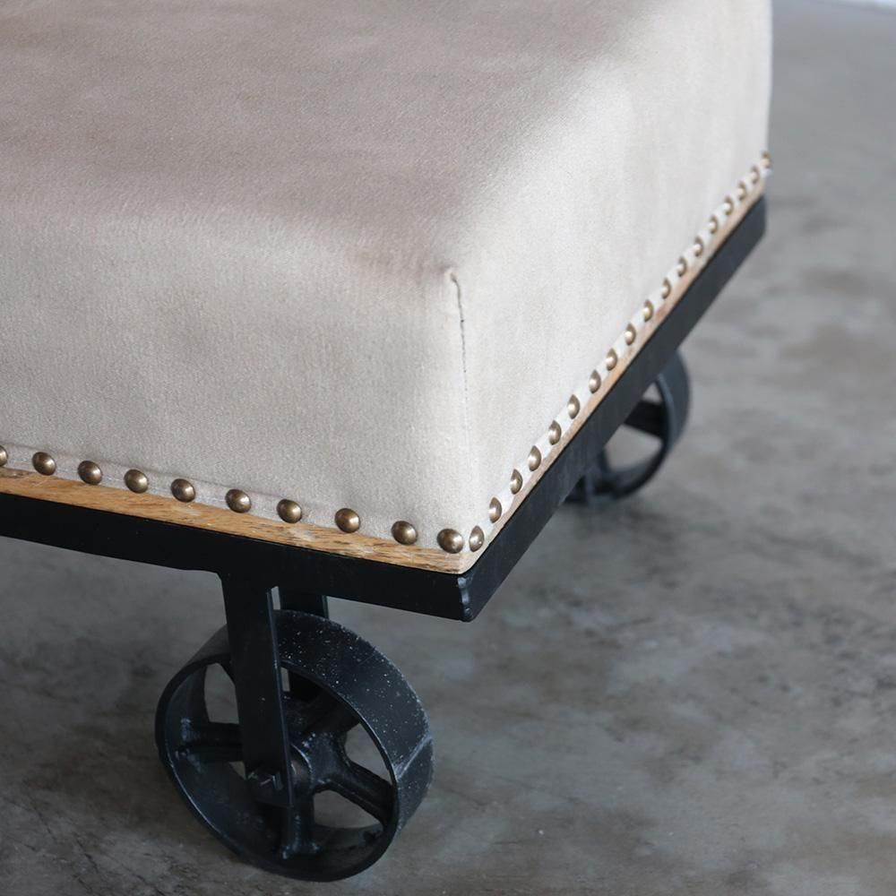 ▮無骨で男前な滑車の付いたベンチあえて綺麗な物を選ばず、玄人好きな本物の男らしさを演出。ヴィンテージ加工を施したファブリックでより男前に。1人暮らしにはもちろん、飲食店でも落ち着いたソファー席に雰囲気よく設置できるかと思います。▮クッション性も良いので抜群の座り心地硬めのクッションを入れて沈み込まない様に座り心地と座った後の見え方にもこだわりました。男性はもちろん、女性にも気に入っていただけるデザインに仕上がっています。キャンバス生地には手作業でヴィンテージ加工を施しているので、一つとして同じものはありません。ヴィンテージ加工したスタッズを使用しています。ストッパーで横へのズレ(転がり)は軽減されます。クッションにはしっかりとした厚みを持たせているので、見た目にも重厚感があります。